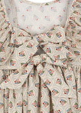 袖にフリルのディテール、背面にリボンのディテールをあしらった柔らかなオーガニックコットンのワンピース。