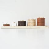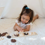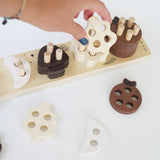 形を認識するのに有効なスタッキングトイです。また数を覚えるのにも有効で、それぞれの形には、どんぐり1個、月2個、きのこ3個、葉っぱ4個、てんとう虫5個と、数える穴の数と同じ数のピースがあります!
