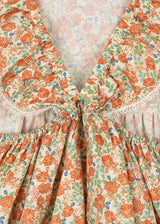 軽く柔らかいオーガニックコットン生地のワンピース。快適さとスタイルを兼ね備えています。 レトロな小花柄プリントとフリルのディテールが特徴で、どんな場面でも目を引く美しさを演出します。ふんわりしたシルエットが素敵なワンピースです。