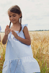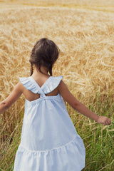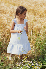 ワンピース裾部分の幅広のフリルが可愛いアイテム。ロマンチックな小さな女の子の春から夏ののワードローブの必需品です。サラッとした軽い着心地は元気なお子様たちも快適に過ごすことが出来ます。