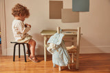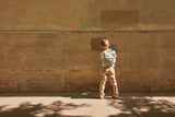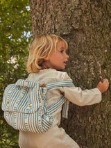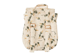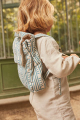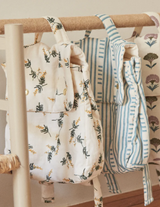 ダブルキルティングコットンガーゼで作られたバックパックは、パットが入っているので持ち運びが快適です。バッグは、2つのきれいな金の真鍮のスナップで簡単に開閉できます。ショルダーストラップは、お子様の肩にぴったりとフィットするように調整が可能。また、内ポケットには持ち物を分けて簡単に取り出すことができます。1歳から4歳ごろまで長くお使いいただけます。