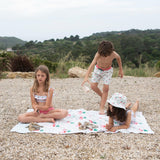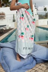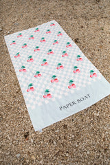 レトロ感あるチェリー柄が印象的なビーチタオル。正方形のブロックチェックがさらにオシャレさをアップしてます。限定生産の特別なアイテムです。