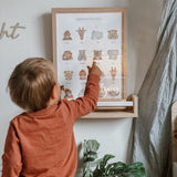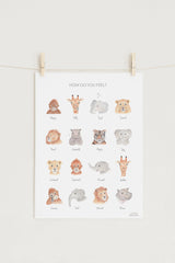 「感情」のアートプリントです。手描きの小さな動物の顔を使って幸せと悲しみの両方を表し、子供たちの感じ方や行動に対する前向きな表現と理解を促します。子供たちが自分の気持ちを認めるように促す素敵なアートです。