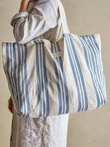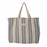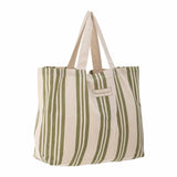 バッグは明るい自然色のコットン100%でできており、ストライプが特徴的です。
