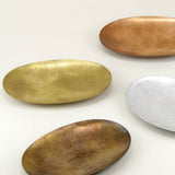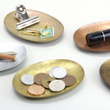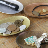 真鍮の素材感をいかし、加工で独特なざらつきと模様をつけた味わい深い趣のある幅10cmほどの楕円型トレイです。アクセサリーや玄関先での鍵や印鑑などを入れたり、クリップや輪ゴム置き、お香立てなどにお使い頂けます。