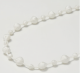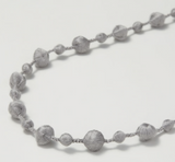 糸玉のサイズは11mmと8mmの2種類。大小の糸玉を交互に配置したデザインです。 シルク100%シリーズの中では、一番人気のアイテム。 ちょうどいい長さで存在感もありながら、14gという糸ならではの軽さが特徴。