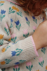 ちょこんとついた丸襟がかわいらしく、ポップでレトロなデザインがおしゃれなカーディガンです。