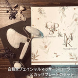 白翡翠カッサプレート&マッサージローラーのセットです。「流す・押す・ほぐす」の作用をもたらす、顔や身体の筋肉の緊張を和らげ、血液循環を促進し、リンパの排出を促進して、むくみ改善などさまざまな効果が期待できます。